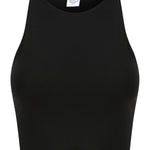 Women's cropped top with racer shape on front and back on neckline. Twin-needle stitching on hem, armholes and neckline. Cropped length. Tear-out label. . BSCI certified. Oeko-Tex certified. Vegan certified. SEDEX certified.