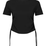 Cropped t-shirt. Short sleeve. Ruched detailing to sides. Tie fastenings. Crew neck. The product contains no branded neck or waist label. Removable kimble or looped garment tags. The inner seam label holds important product information on one label with a second label containing brand information which can be cut-away. Oeko-Tex fabric only, Amfori BSCI and Sedex certified.