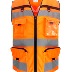 Heavy-duty, hi-vis ripstop tool vest with multiple pockets for convenience at work. Two double pockets accessed from the top with zip and hook and loop closure. Double D rings. Chest pockets with flap closure and pulls. ID card display. Adjustable hem with two press buttons. Also available with open mesh on the bottom to provide better breathability and comfort in hot working environments and seasons. Conforms to EN ISO20471:2013 Class 2. Large decoration area on the back. Certified Sedex and OEKO-TEX®.