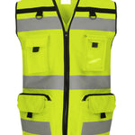 Heavy-duty, hi-vis ripstop tool vest with multiple pockets for convenience at work. Two double pockets accessed from the top with zip and hook and loop closure. Double D rings. Chest pockets with flap closure and pulls. ID card display. Adjustable hem with two press buttons. Also available with open mesh on the bottom to provide better breathability and comfort in hot working environments and seasons. Conforms to EN ISO20471:2013 Class 2. Large decoration area on the back. Certified Sedex and OEKO-TEX®.